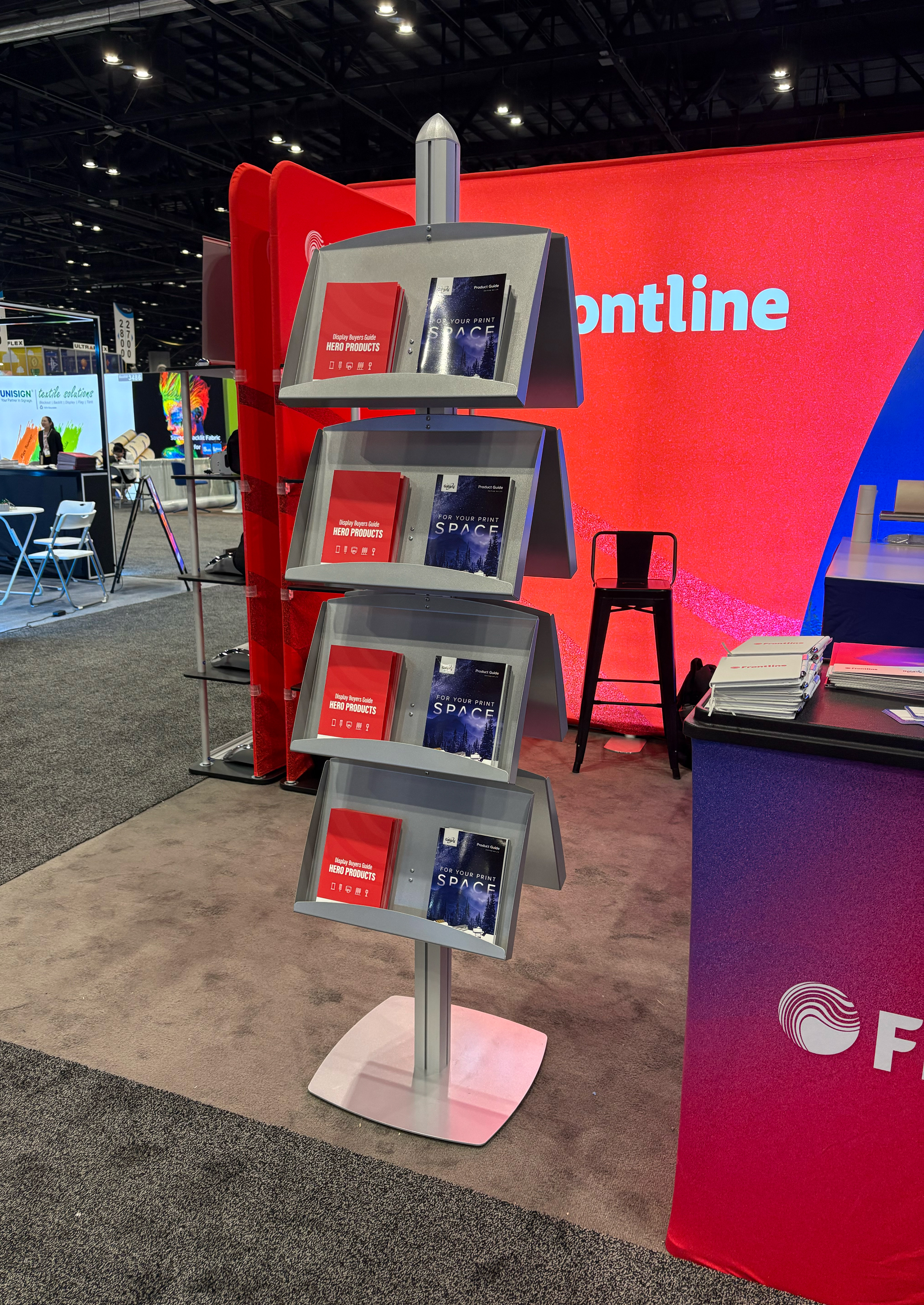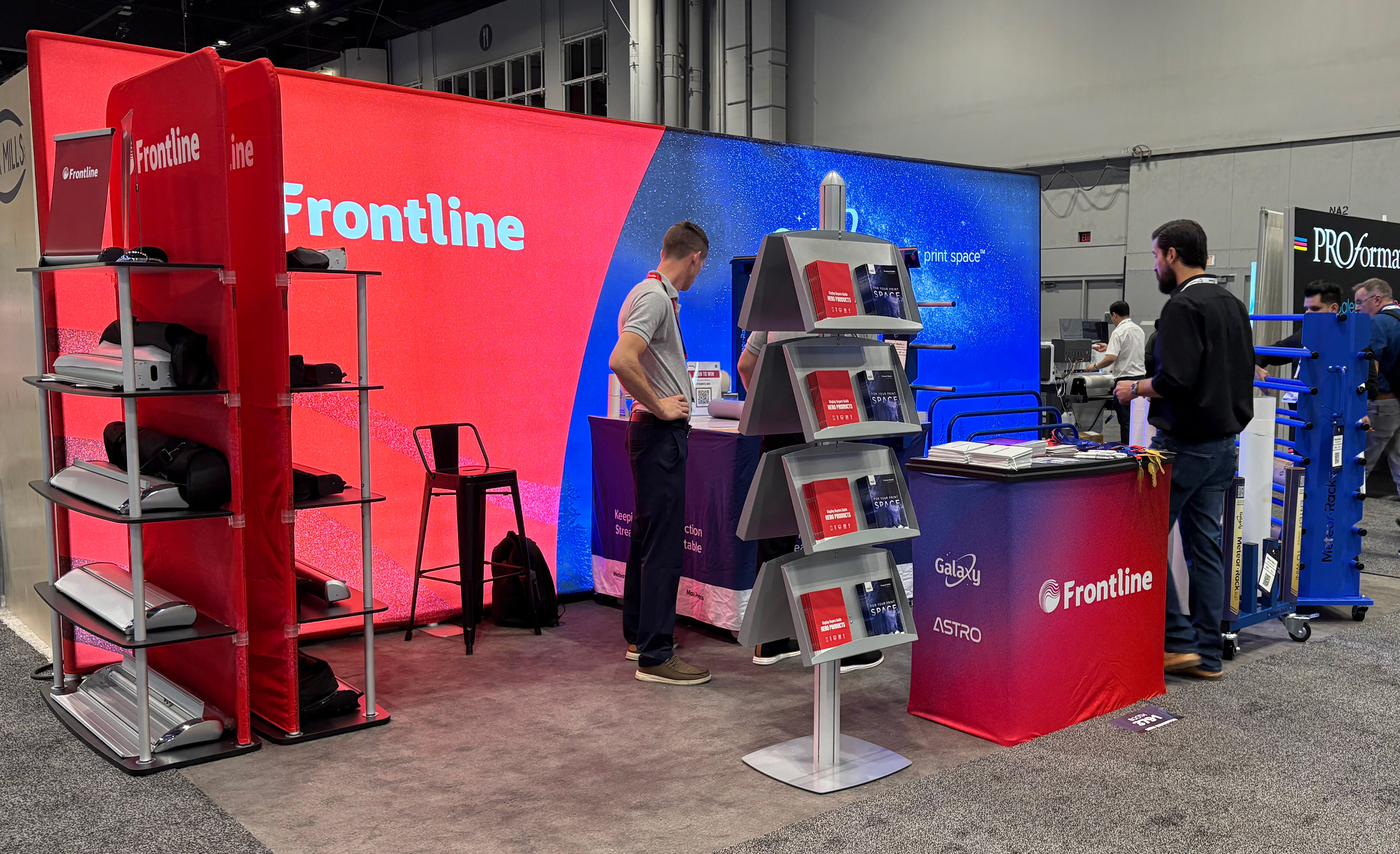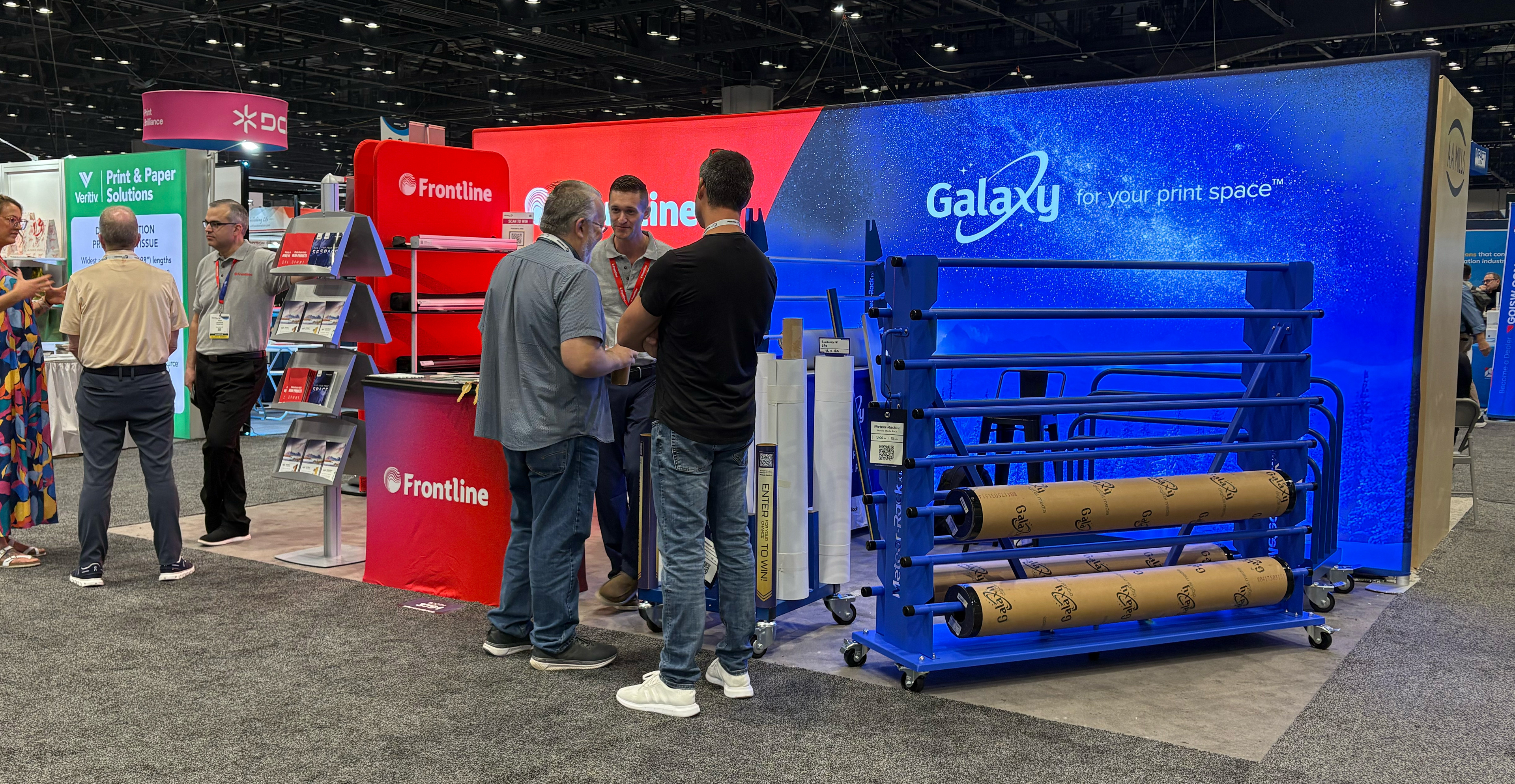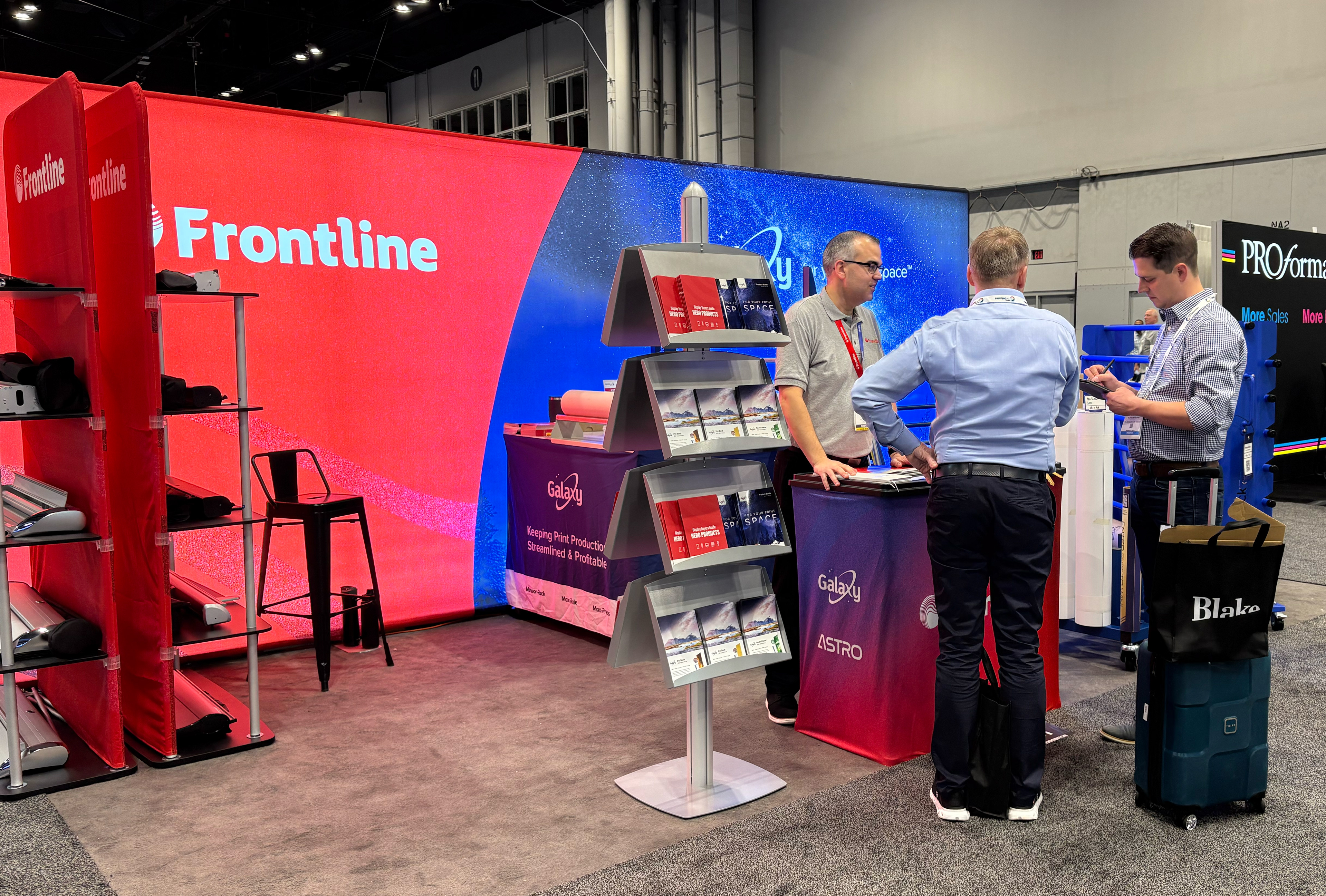 Every pocket folder included a business card for Frontline, a mini-catalog, and a product line card co-branded with a distributor's contact information. Additional pieces that could be included per each visitor were Galaxy™ printed media swatches, a lanyard, pen, or notebook.