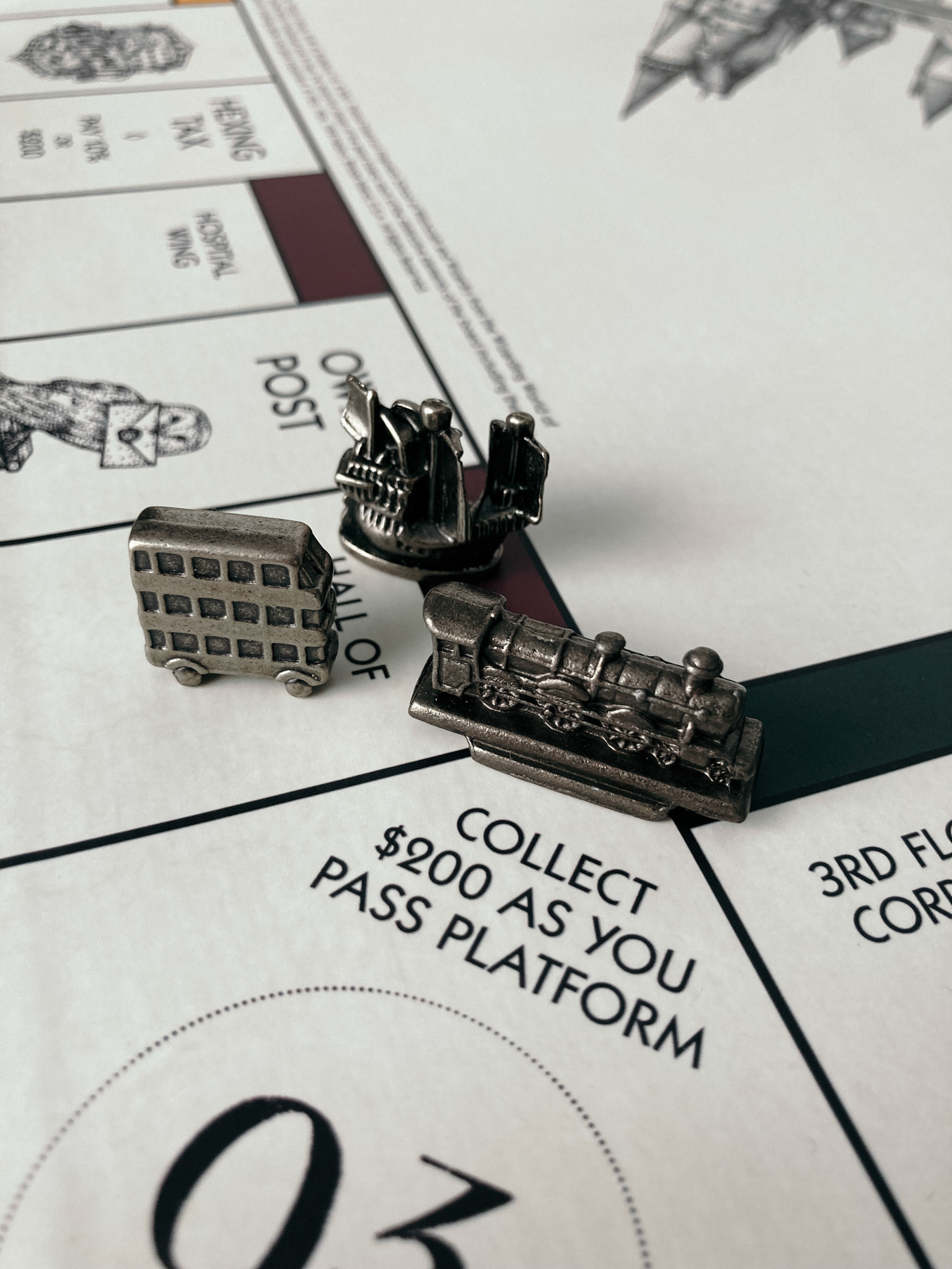 Using the original board design of MONOPOLY as a starting point, I swapped out elements of the game to follow the Hogwarts theme.